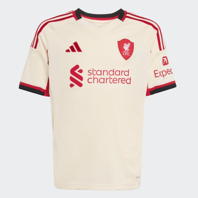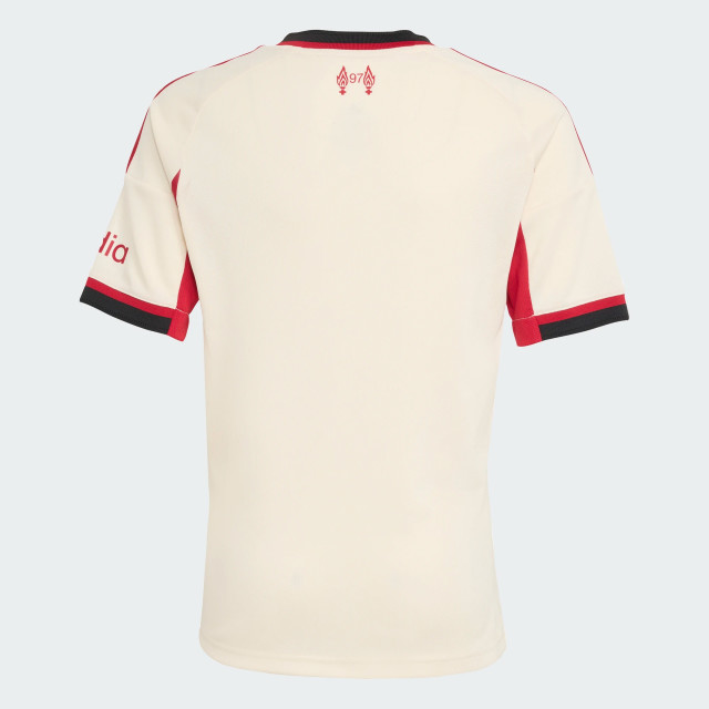 Away Jersey Junior 2025/26. In the 25/26 season, everywhere is Anfield. Created to represent Liverpool FC's iconic home ground on away days, this juniors' adidas football jersey displays a specially made crest whose shape was inspired by the arched gable atop the stadium's old Main Stand. Moisture-managing AEROREADY and soft fabric combine to keep travelling fans comfortable. The off-white shade will be familiar to Reds who know their history.
